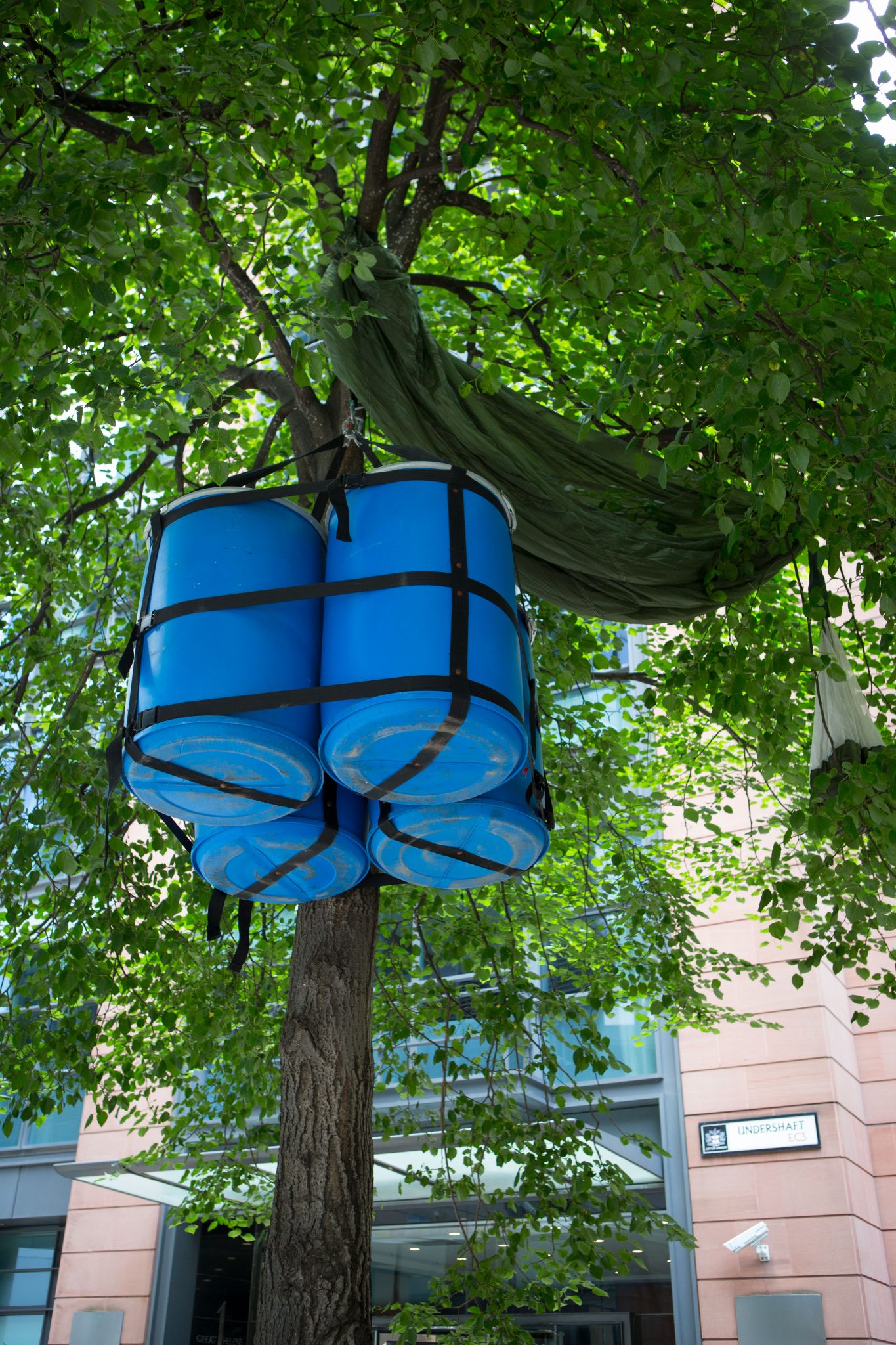 Conical parachute, polythene barrels, nylon webbing, aluminium fixings, items from the artist's collection, stainless steel etched plaque