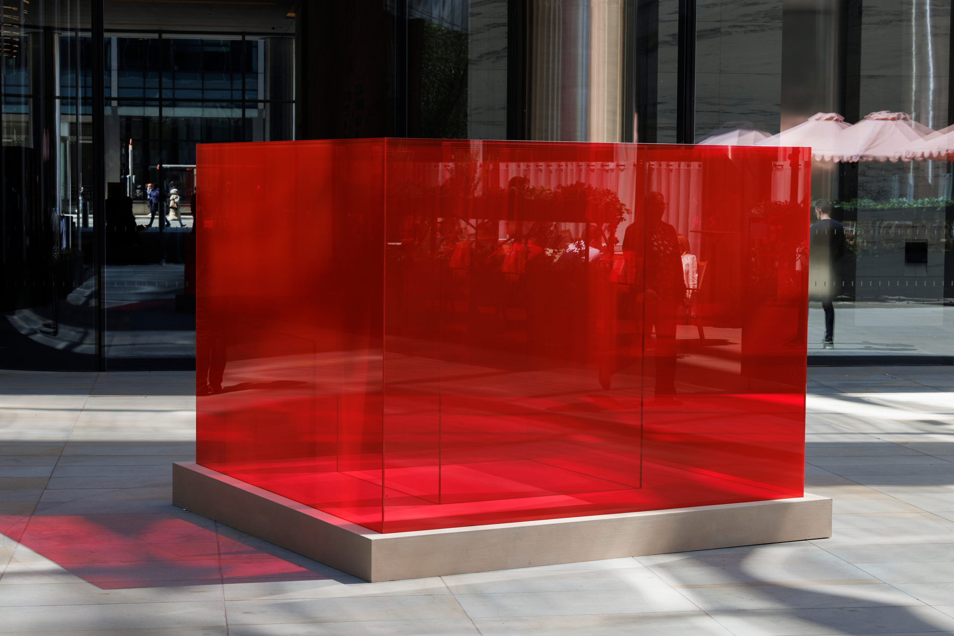 Pacific Red (IV) (2017) encapsulates the mesmerising metamorphosis and innovation that characterises Larry Bell’s Pacific Red nesting box glass sculptures, which mark a turning point in the artist’s extraordinary practice and were a celebrated highlight of the 2017 Whitney Biennial. Bell’s nesting boxes are one of the most important examples of the artist’s freestanding glass wall sculptures, a subset of Bell’s practice which he began in 1968 in which the artist combines panes of glass in varying scales and configurations. These large, colourful outdoor works respond intuitively to the dynamics of space and are transformed by the particular conditions of natural light at different times of the day. Capturing the distinctive properties of the colour red, Pacific Red (IV) exemplifies what Bell described as its ‘emotional input’. Combining cubes made with Red Poppy and Blush laminated glass sheets, the sculpture’s luminous reds, transparency and reflectiveness shift and morph in response to the sun, at times emitting an ethereal glow, which transforms into a red-hot blaze at other moments. An extraordinary sculpture, Pacific Red (IV) epitomises the unique magic of Bell’s lyrical experimentation with glass.